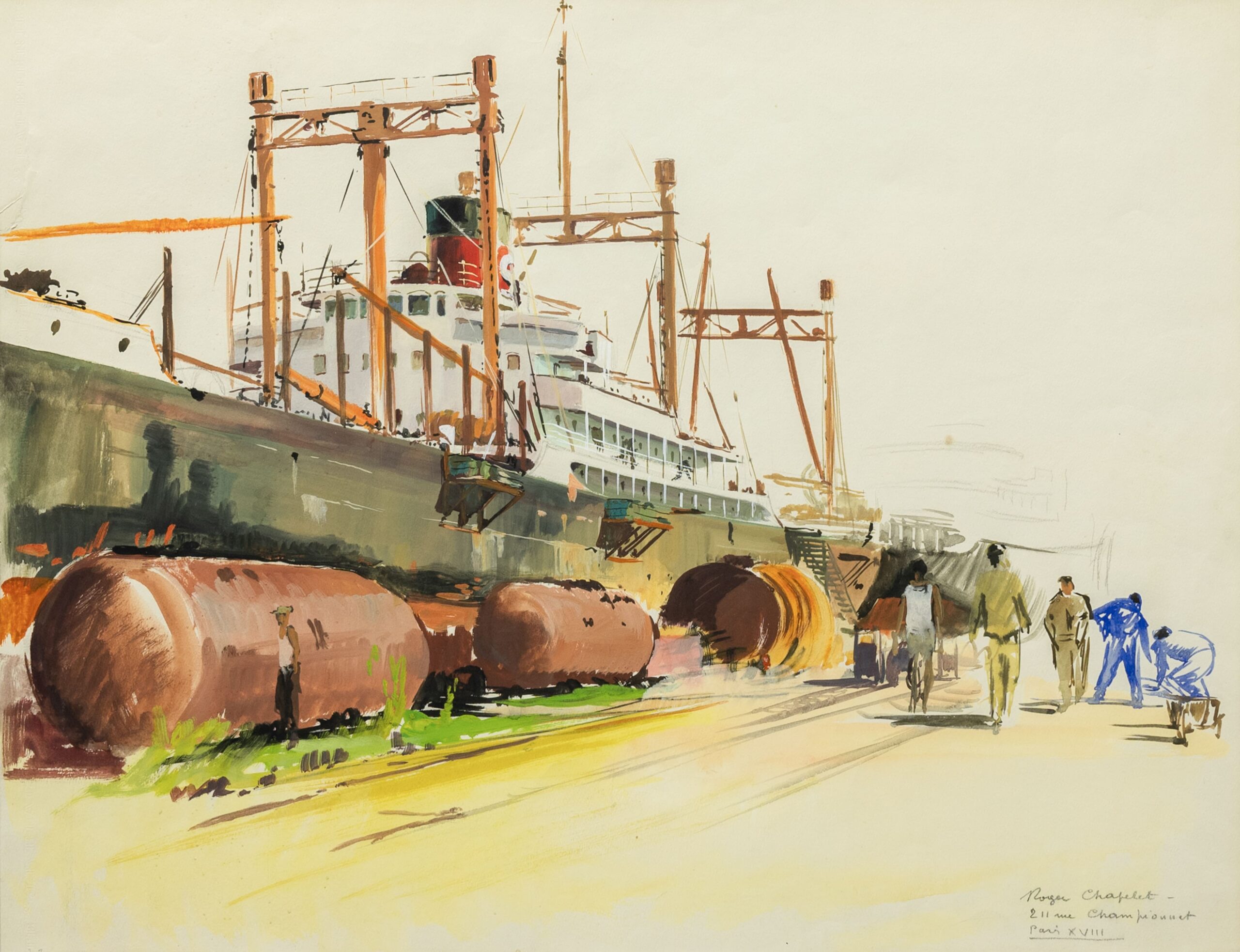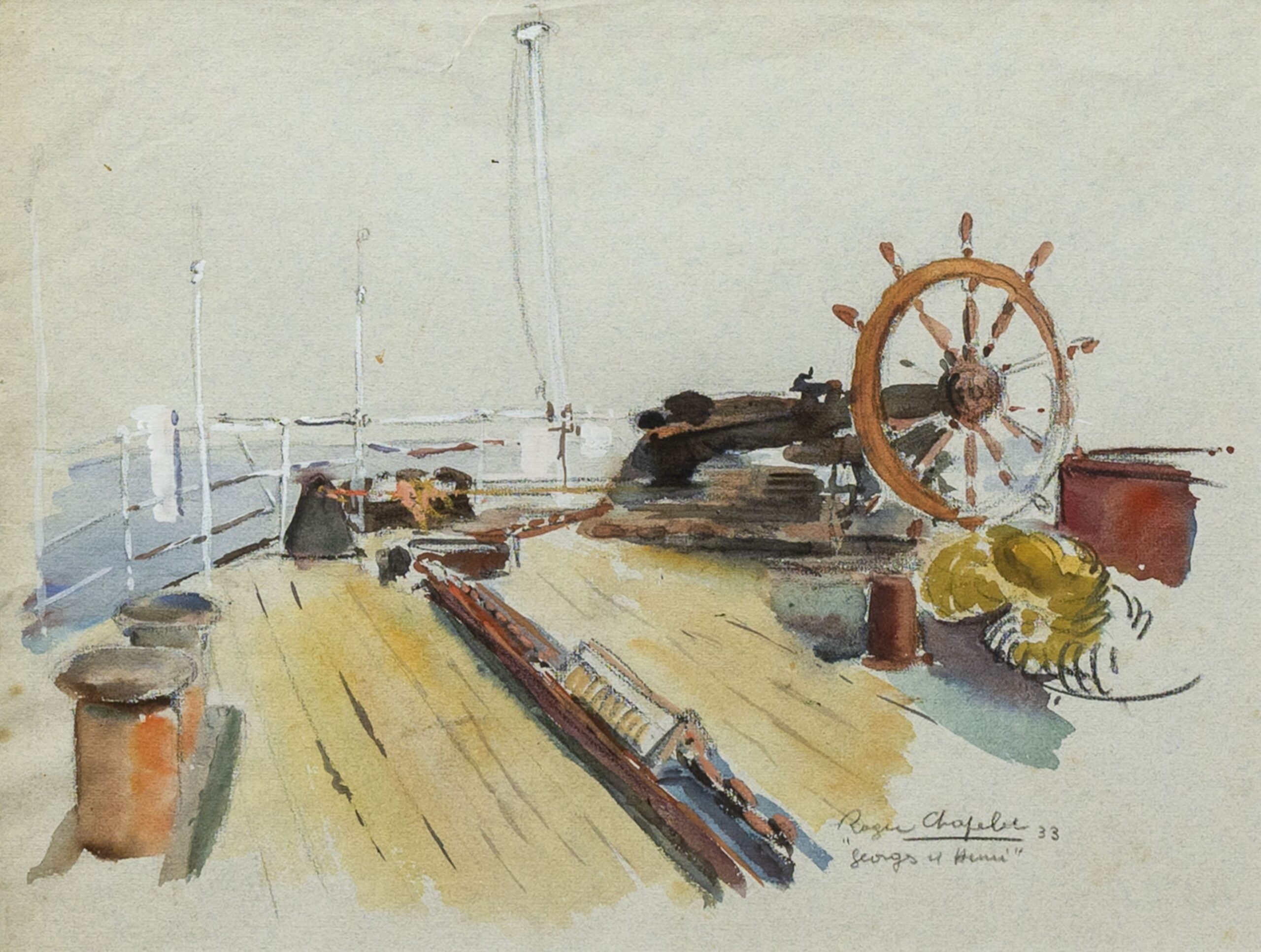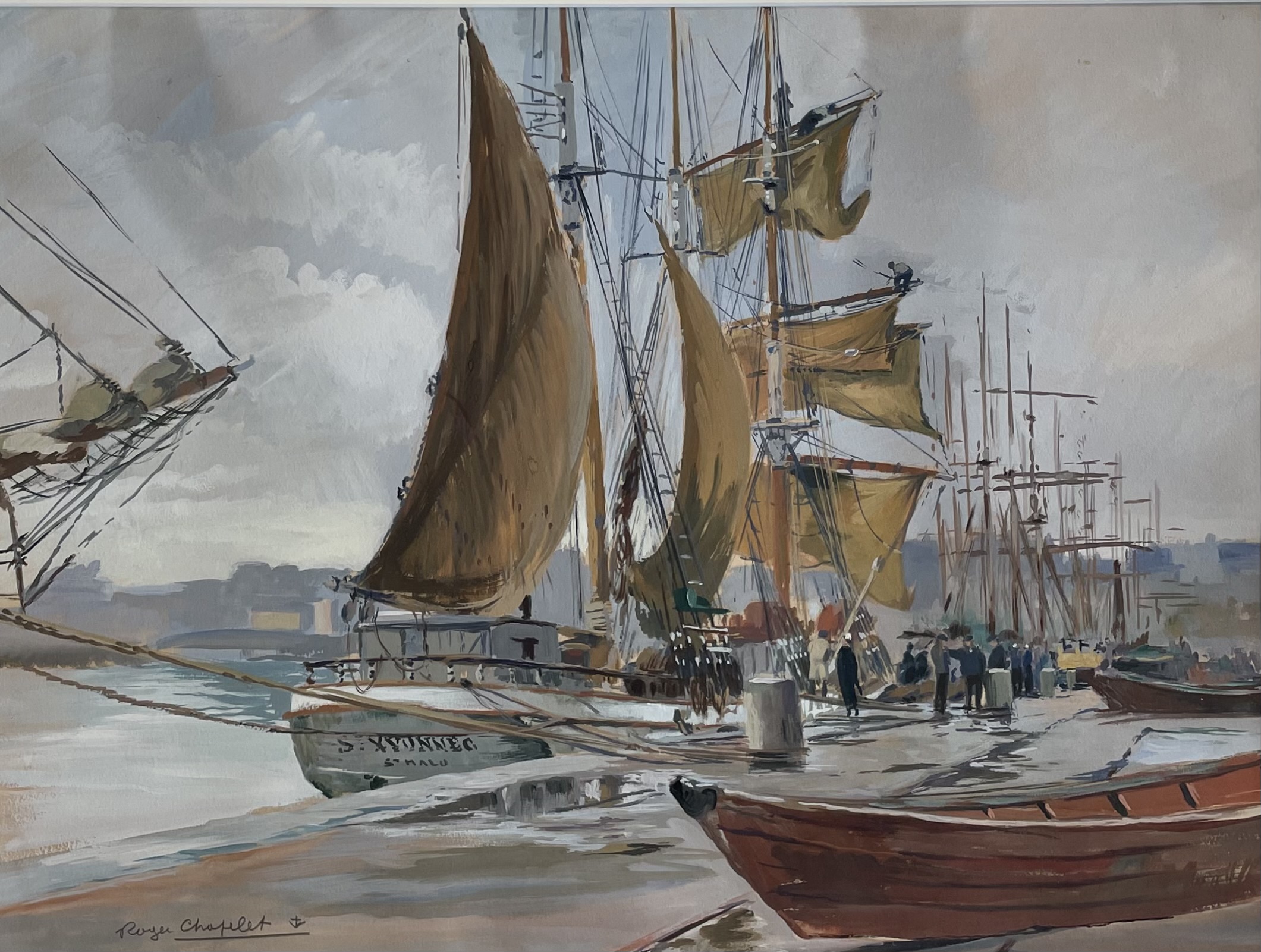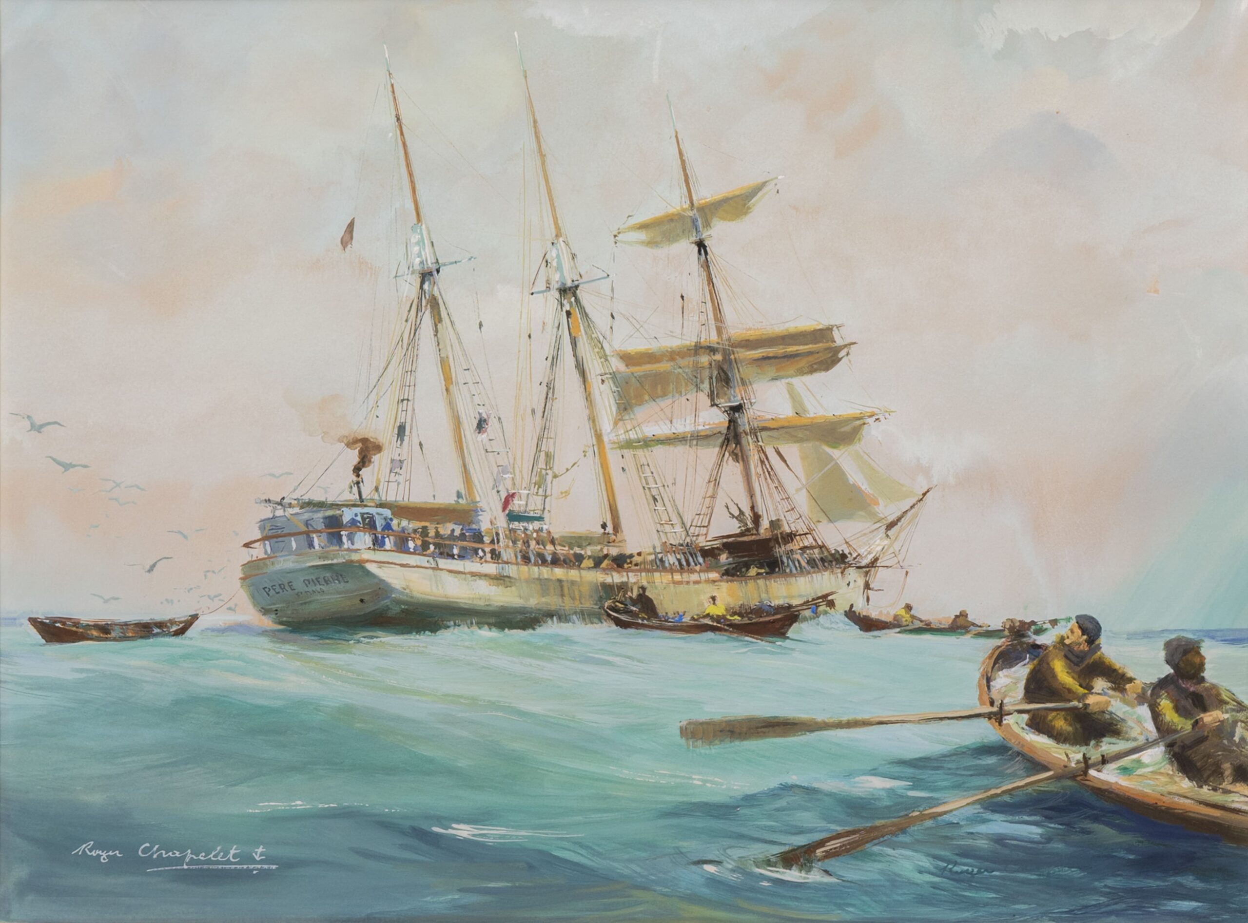 La Galerie Winston Dinard propose aujourd’hui une sélection d’œuvres originales de Roger Chapelet : huiles, gouaches, dessins. Elle s’attache à mettre en lumière les multiples facettes d’un artiste qui fut à la fois peintre embarqué, affichiste, et témoin sensible d’un monde maritime en mutation.