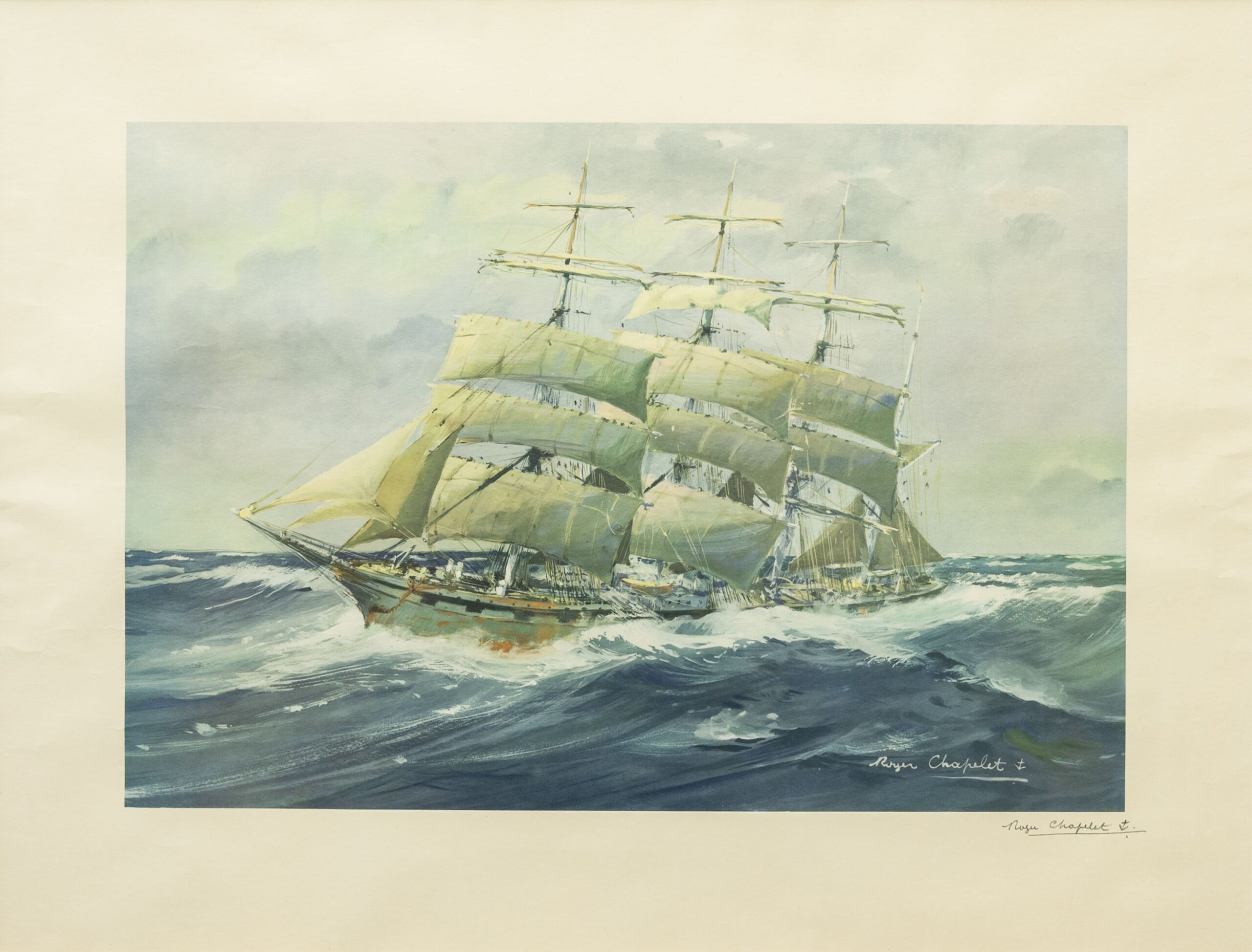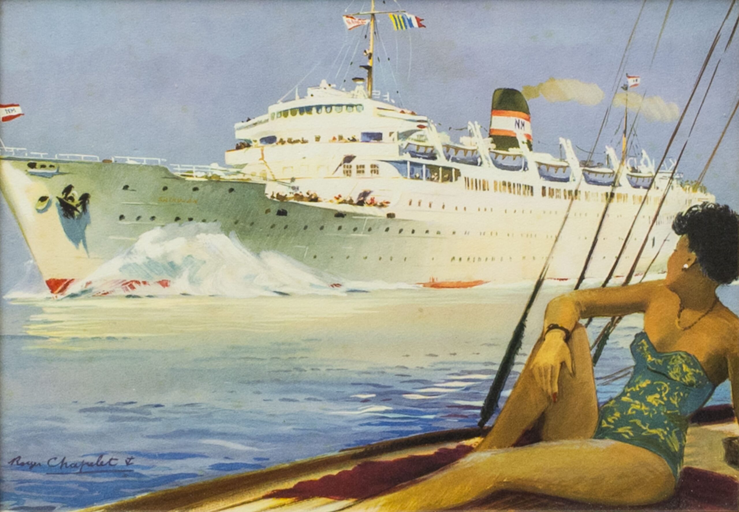 Dans les années 1930, Roger Chapelet devient l’un des affichistes les plus sollicités par les grands armements français. Il signe des affiches emblématiques pour des compagnies comme la Compagnie Transatlantique, la Compagnie Mixte ou encore Paquet. Son travail renouvelle l’image du voyage maritime dans l’entre-deux-guerres.