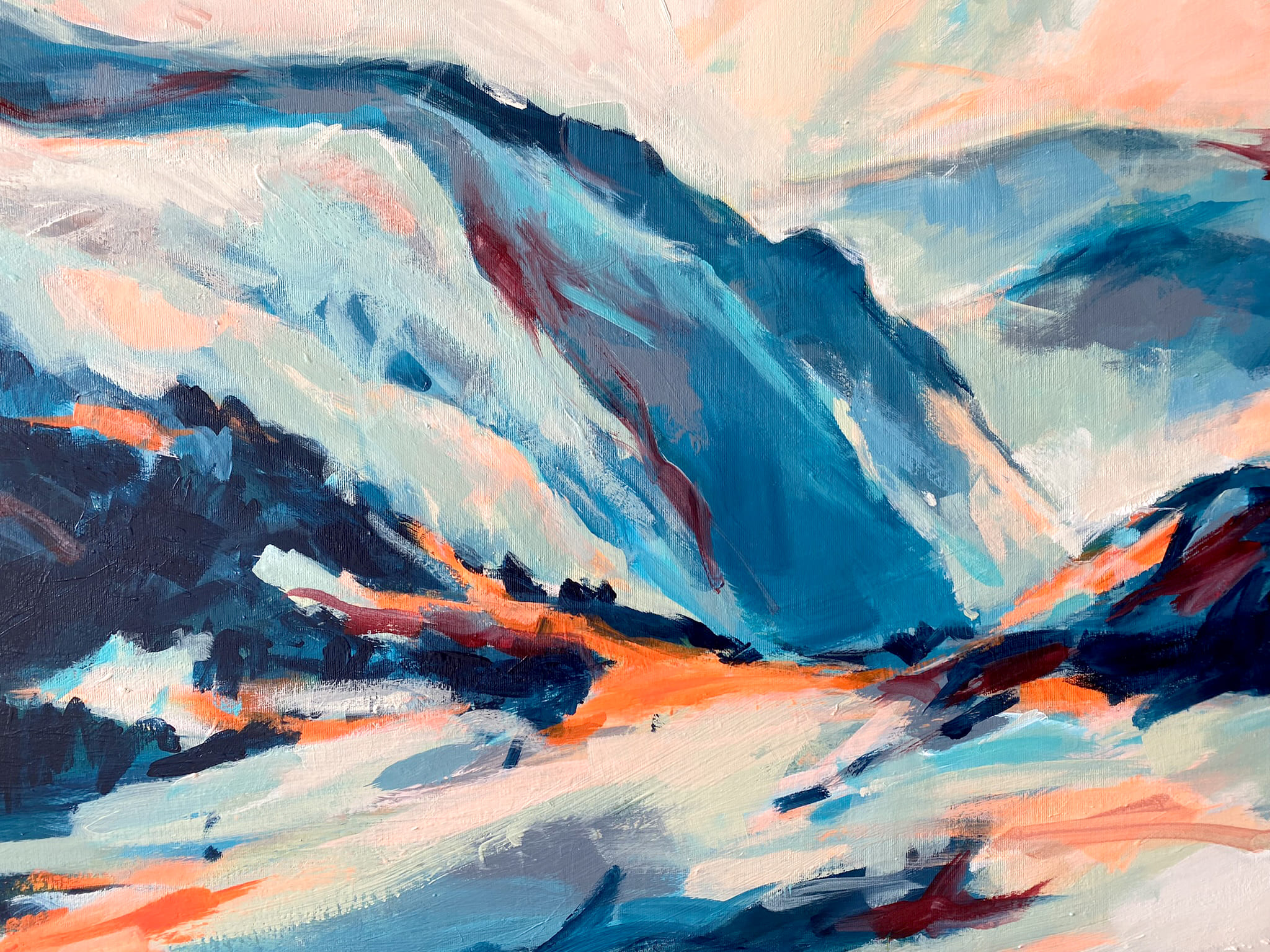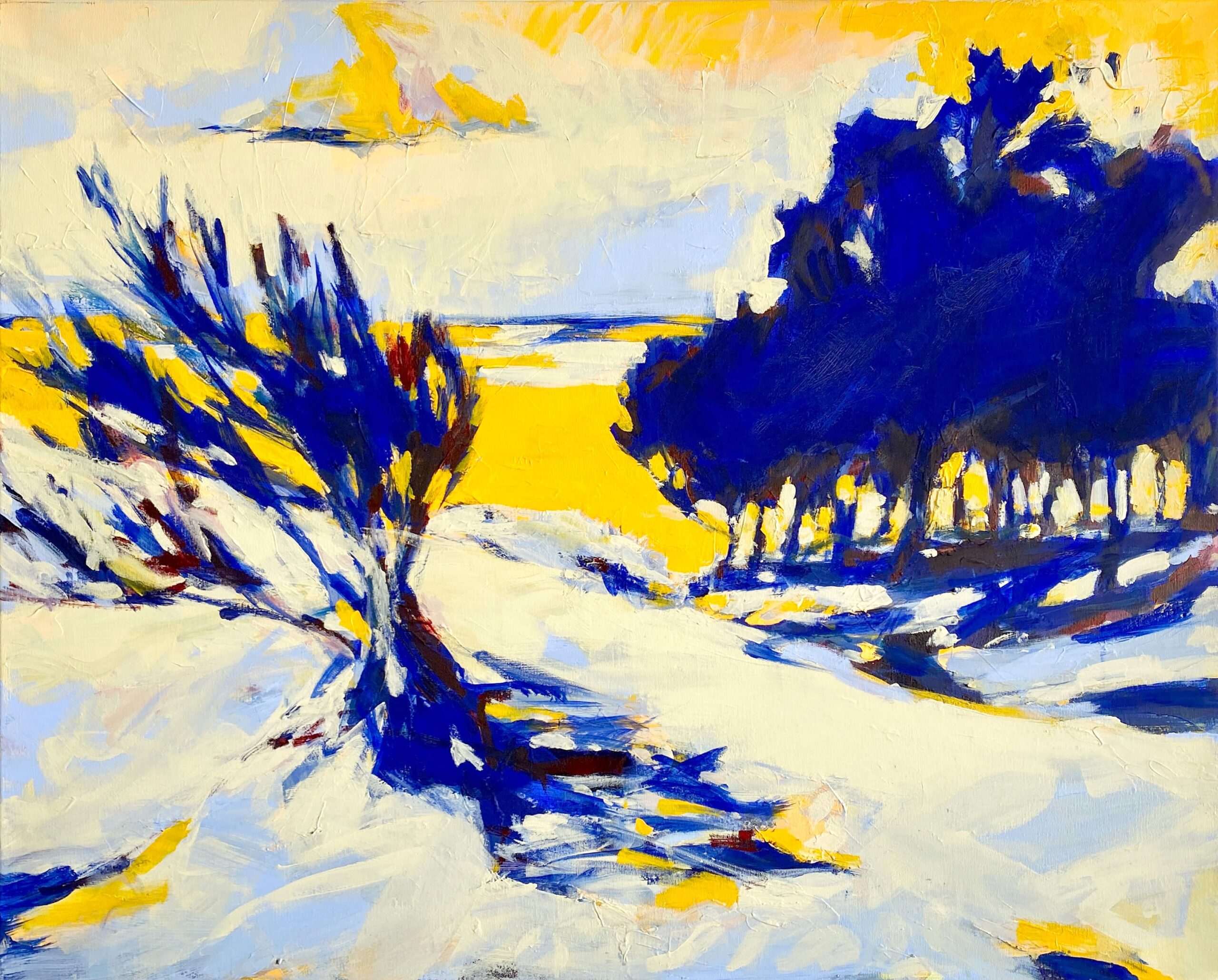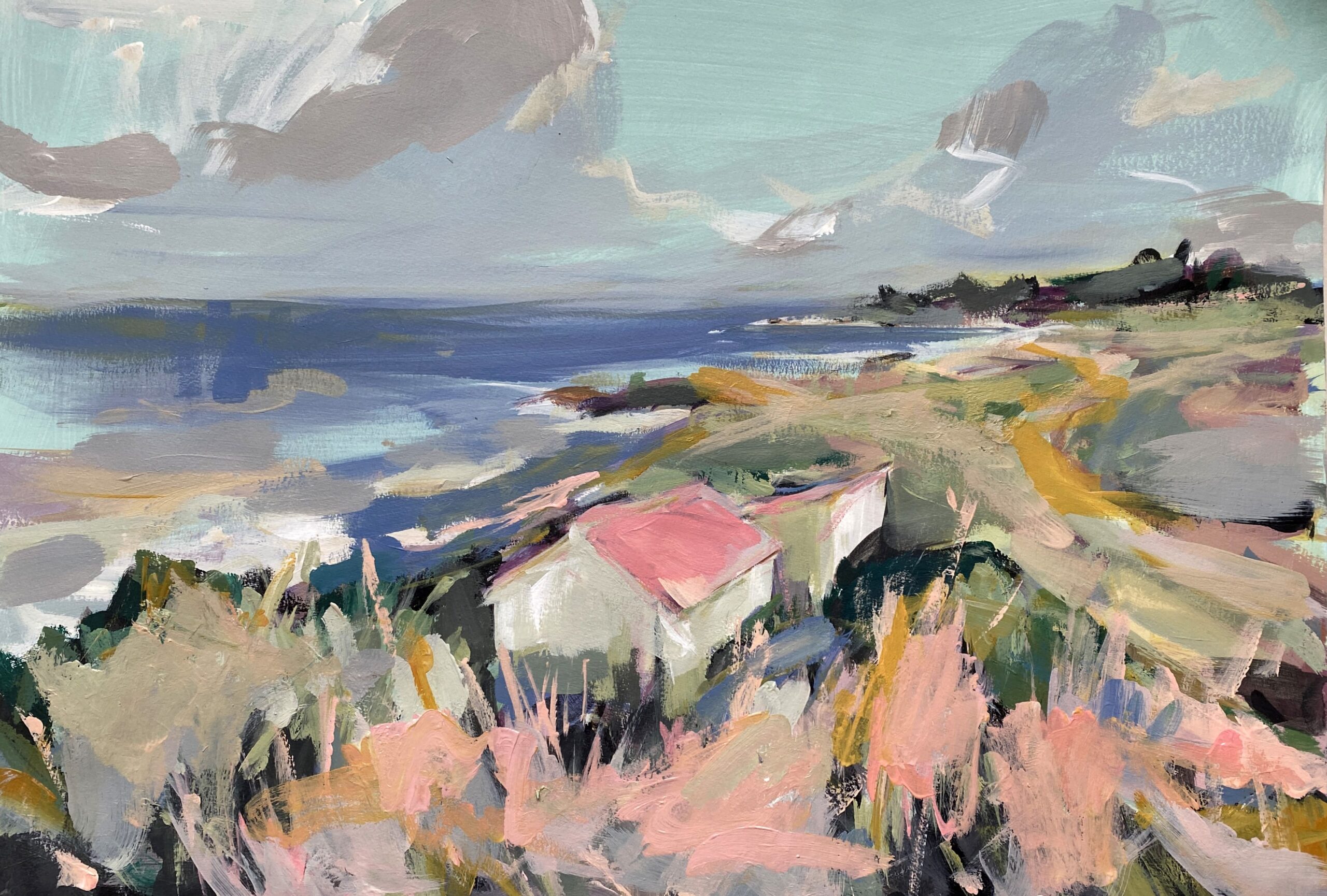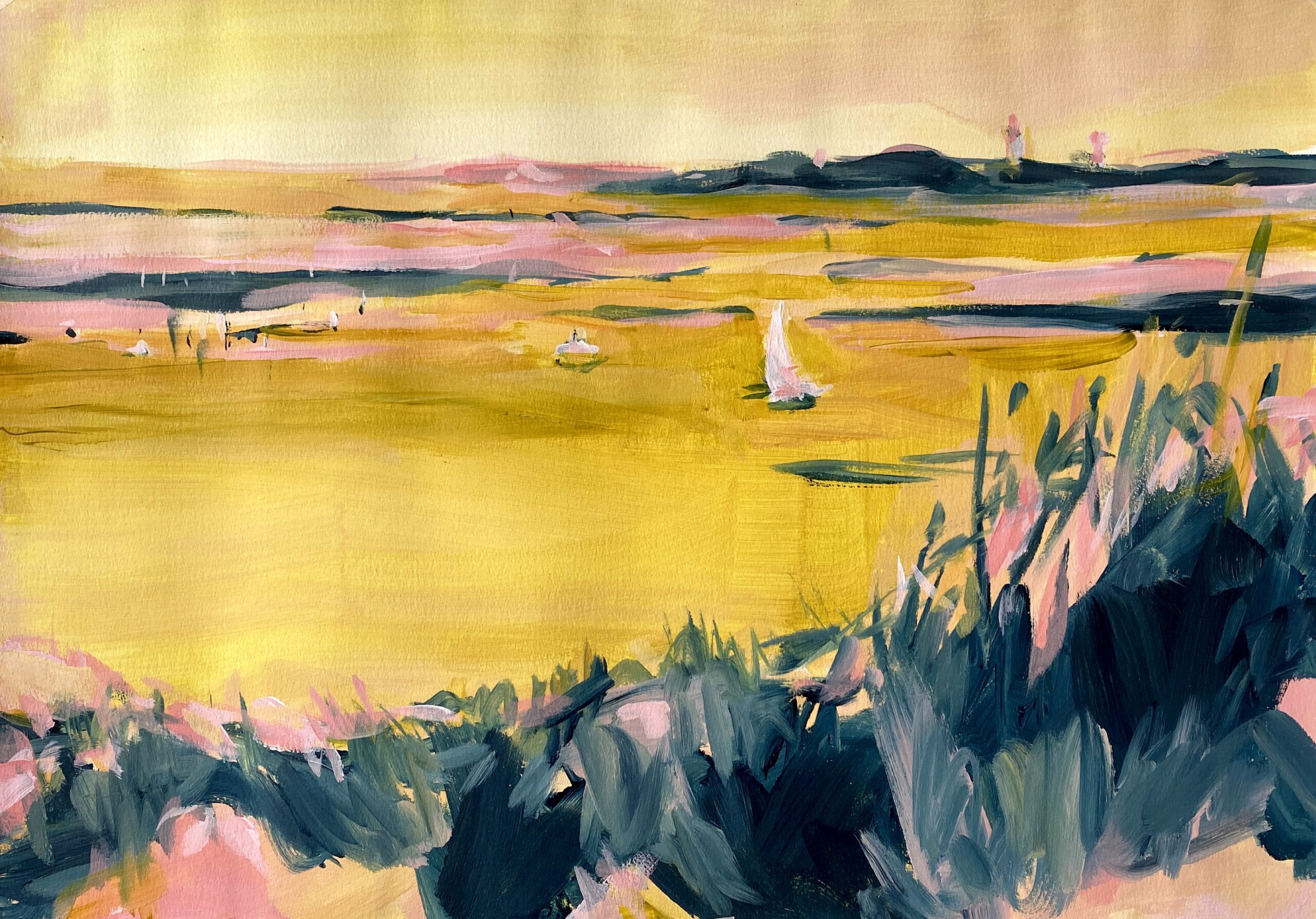 Elle axe sa réflexion autour de la composition et de la couleur. Travaillant en études successives, elle recompose de manière séquentielle son sujet qui lui permet de conserver un ancrage dans le réel. Par l’usage d’une palette de couleurs réduite, vive et contrastée, elle restitue son exploration émotionnelle et sensorielle des paysages qu’elle a admiré.
