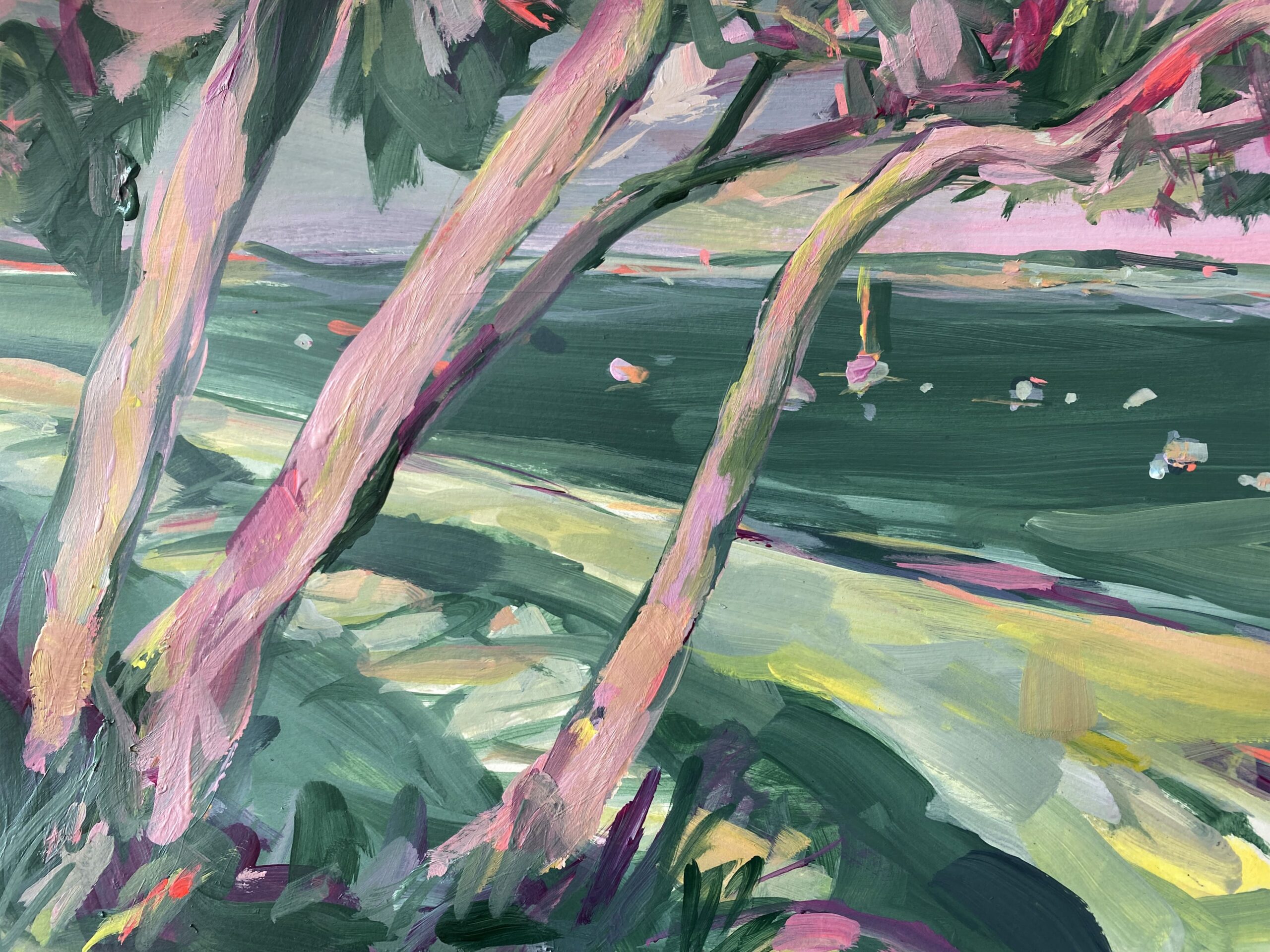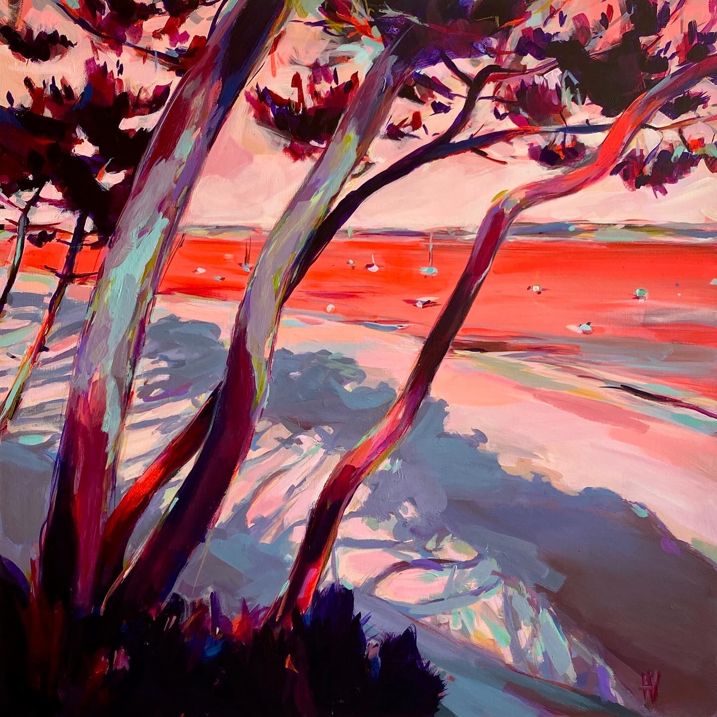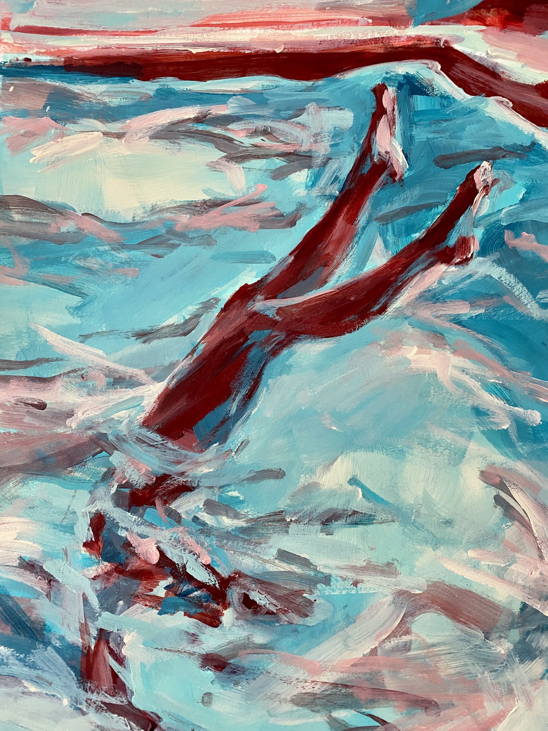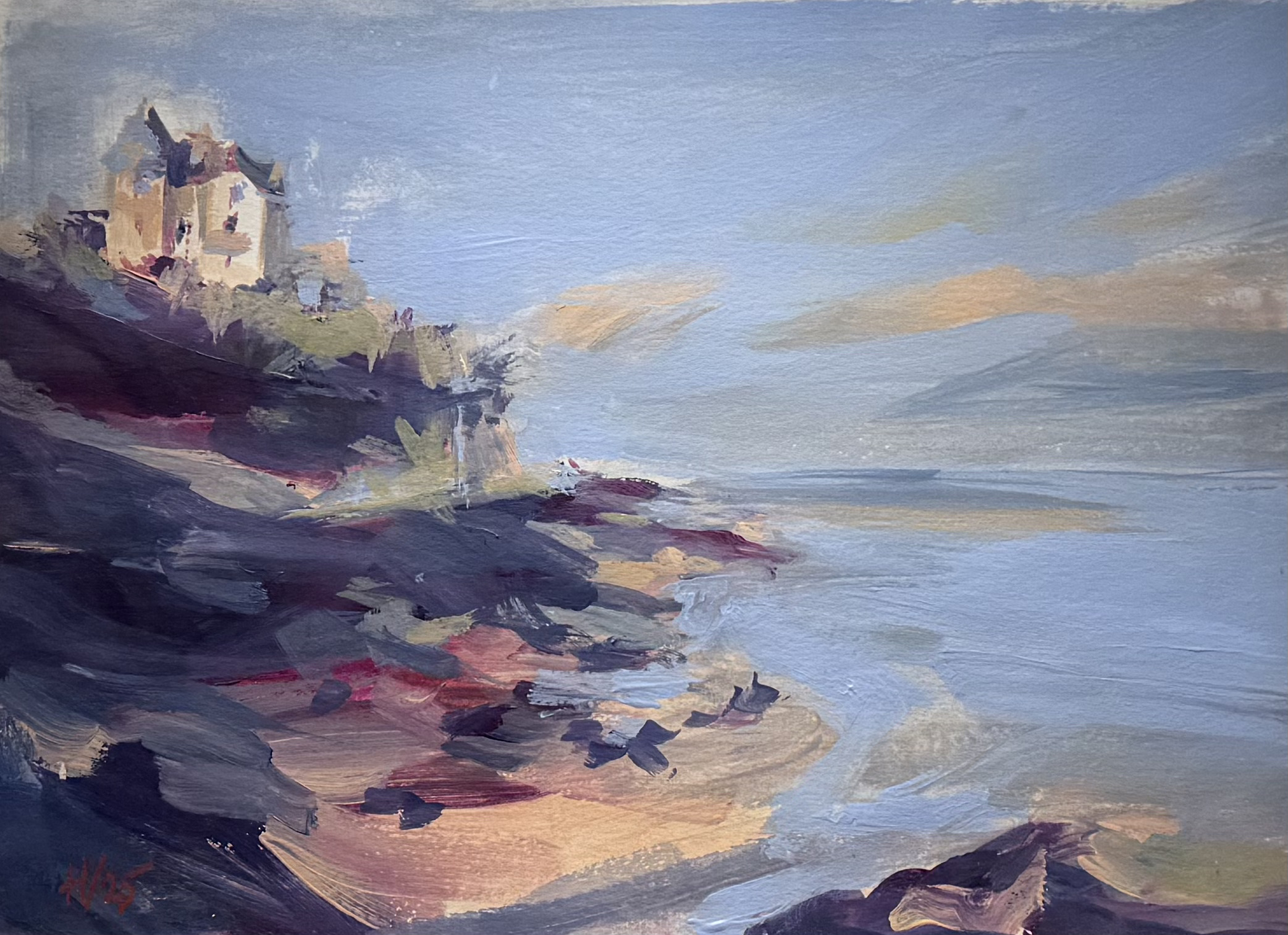 Elle axe sa réflexion autour de la composition et de la couleur. Travaillant en études successives, elle recompose de manière séquentielle son sujet qui lui permet de conserver un ancrage dans le réel. Par l’usage d’une palette de couleurs réduite, vive et contrastée, elle restitue son exploration émotionnelle et sensorielle des paysages qu’elle a admiré.