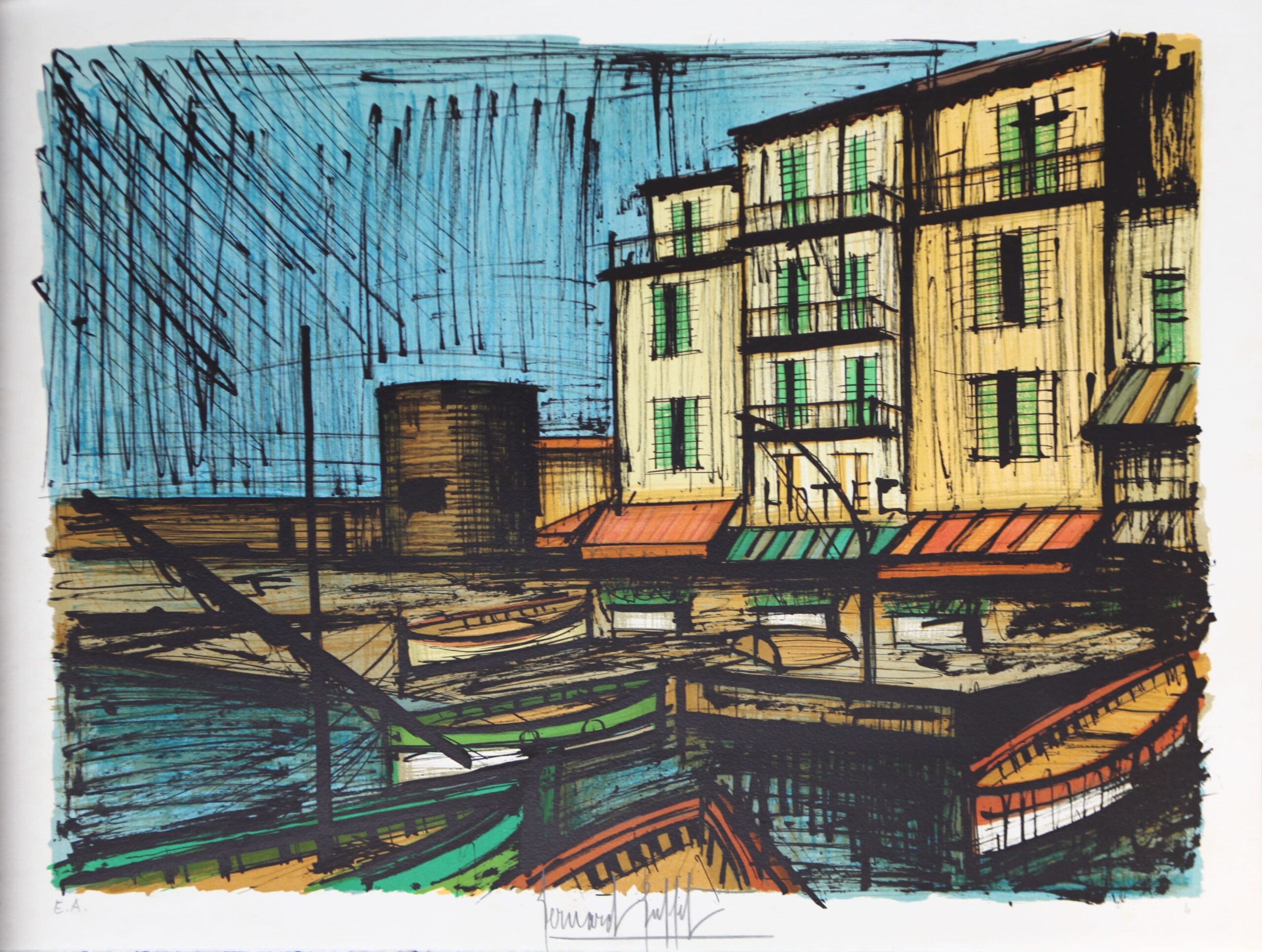 Saint-Tropez, source d’inspiration lumineuse, est représentée dans toute sa grandeur : la baie scintillante, les voiliers élégants et les paysages méditerranéens. Chaque lithographie témoigne du talent exceptionnel de Buffet, combinant rigueur graphique et expressivité, pour rendre hommage à la lumière et à l’énergie de la Côte d’Azur.