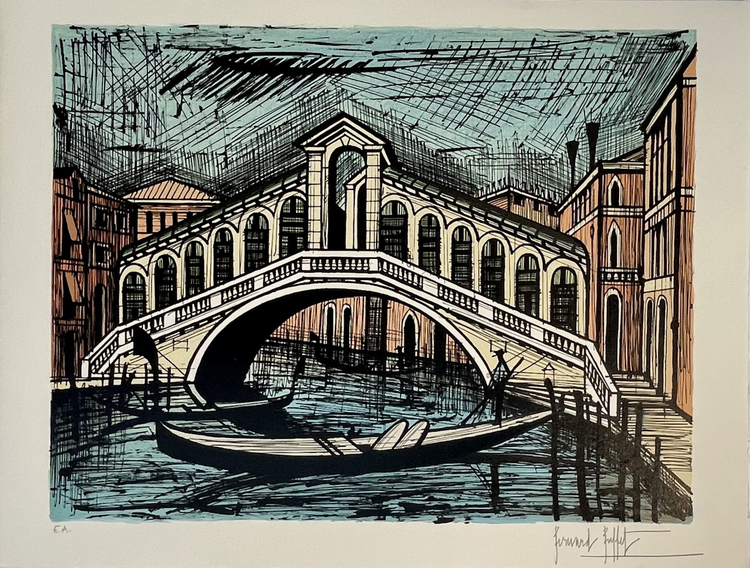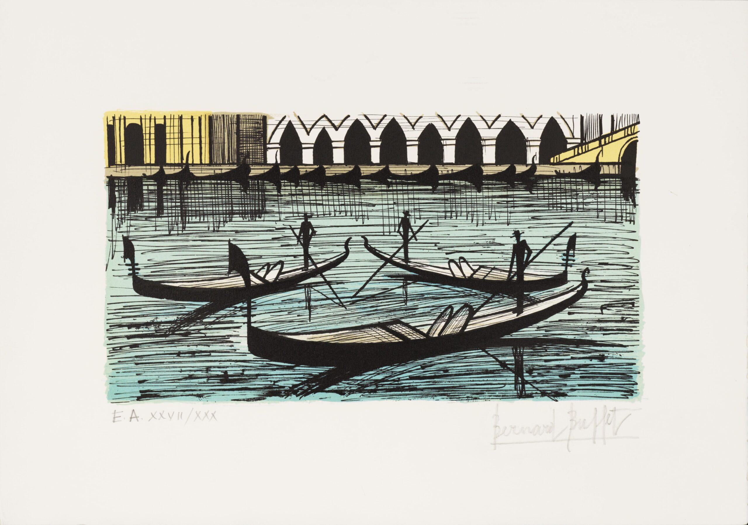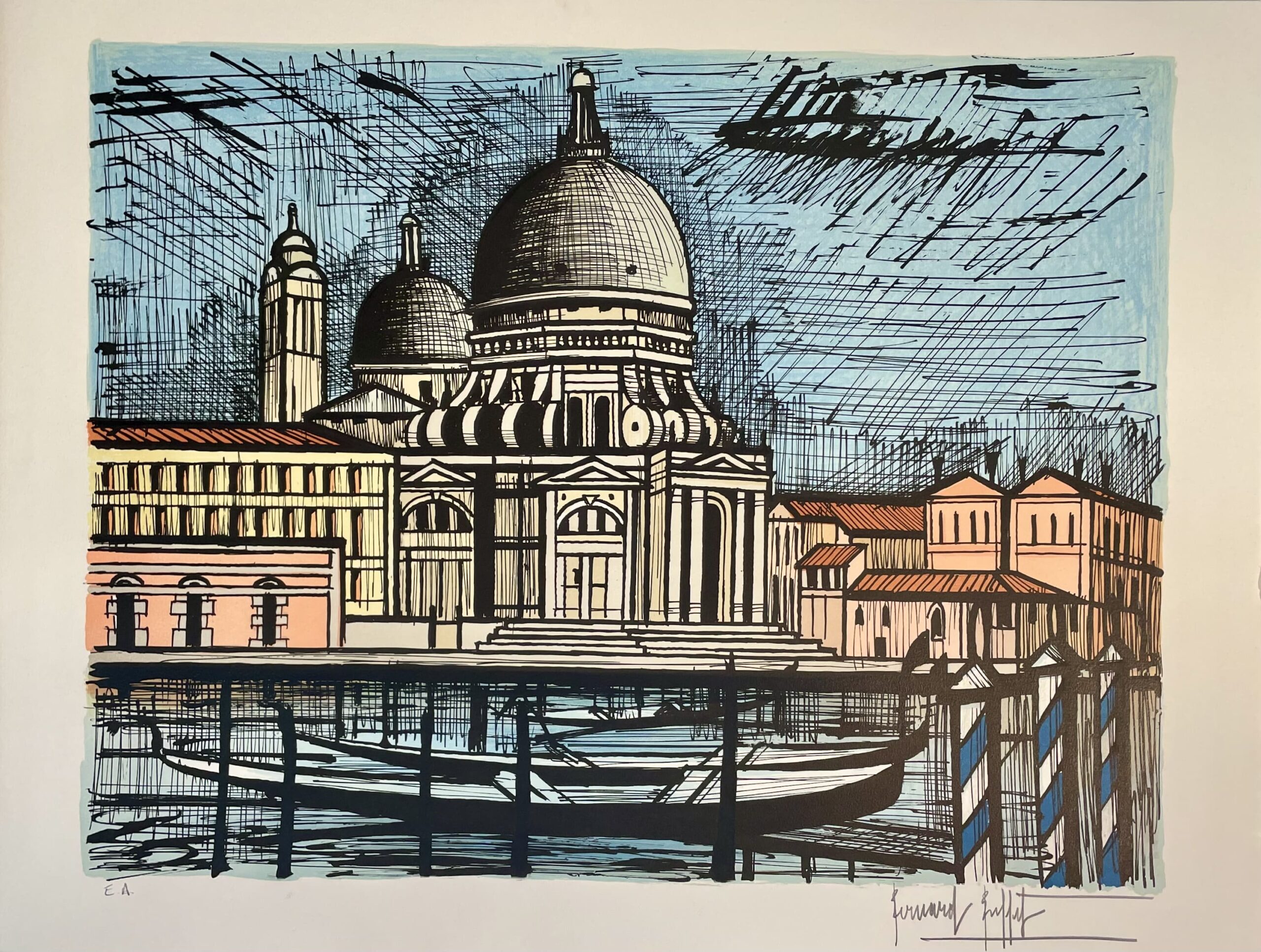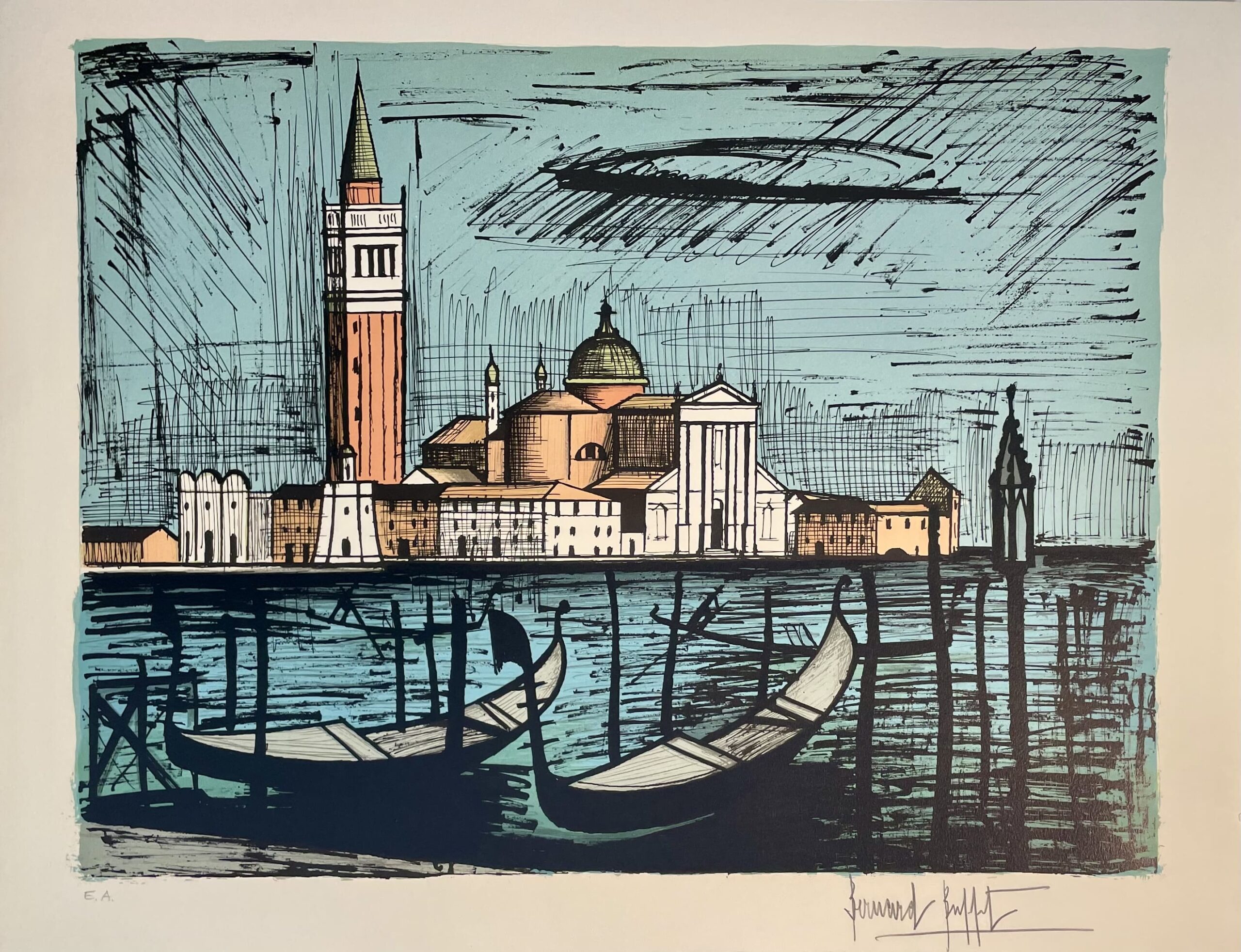 Les lithographies originales de Bernard Buffet consacrées à Venise capturent l’essence intemporelle de cette ville mythique. À travers ses œuvres, l’artiste mêle sa palette caractéristique de tons subtils et contrastés à une architecture évocatrice, immortalisant des lieux emblématiques tels que la Basilique Santa Maria della Salute, le Pont des Soupirs et l’Isola di San Giorgio.